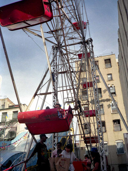 O ja, we zijn nog in het reuzenrad in Little Italy geweest. Zo’n oud roestig ding en de bakken die eraan hangen waren half verrot. Je keek zo door de bodem. Halverwege moest een werknemer een bak vastdraaien. Het rad stopte dus en hij ging sleutelen. Vreemd?!