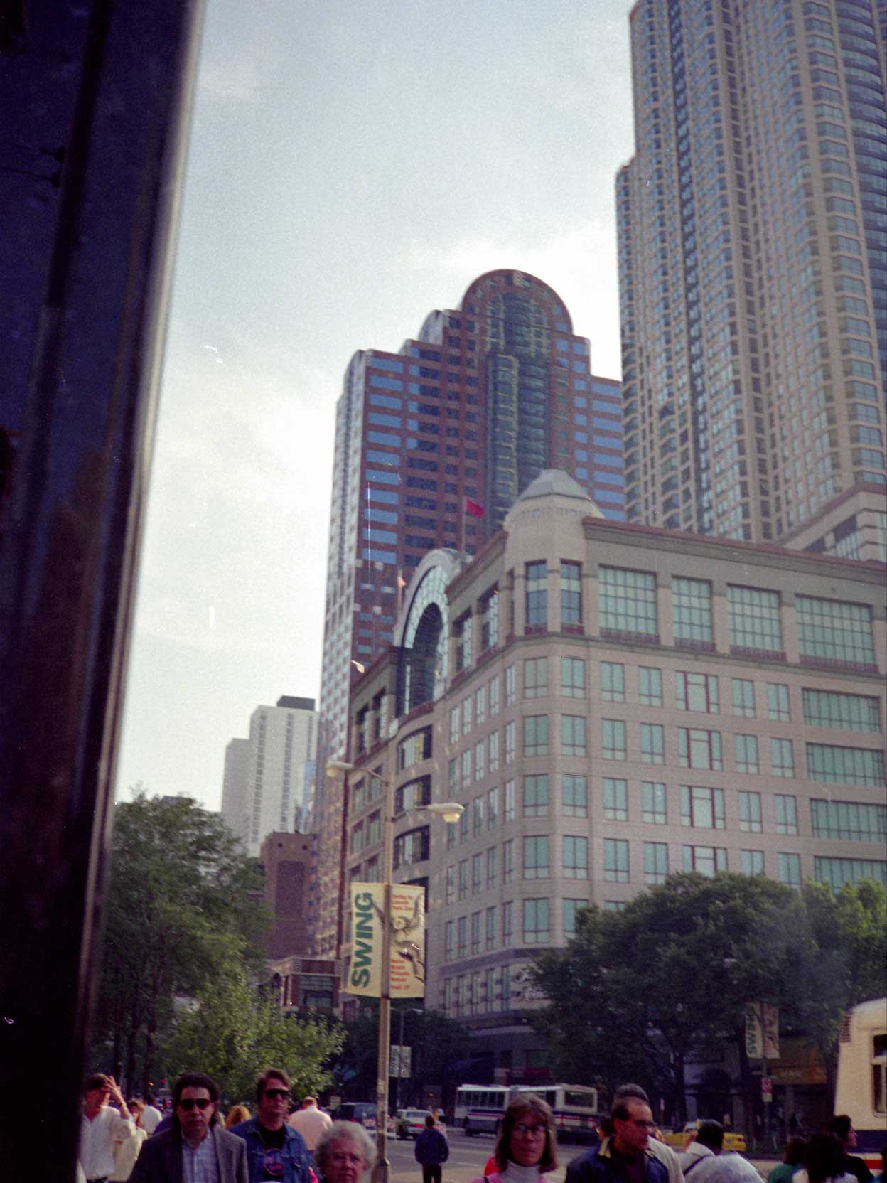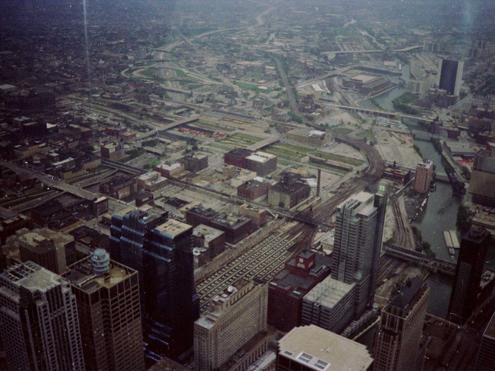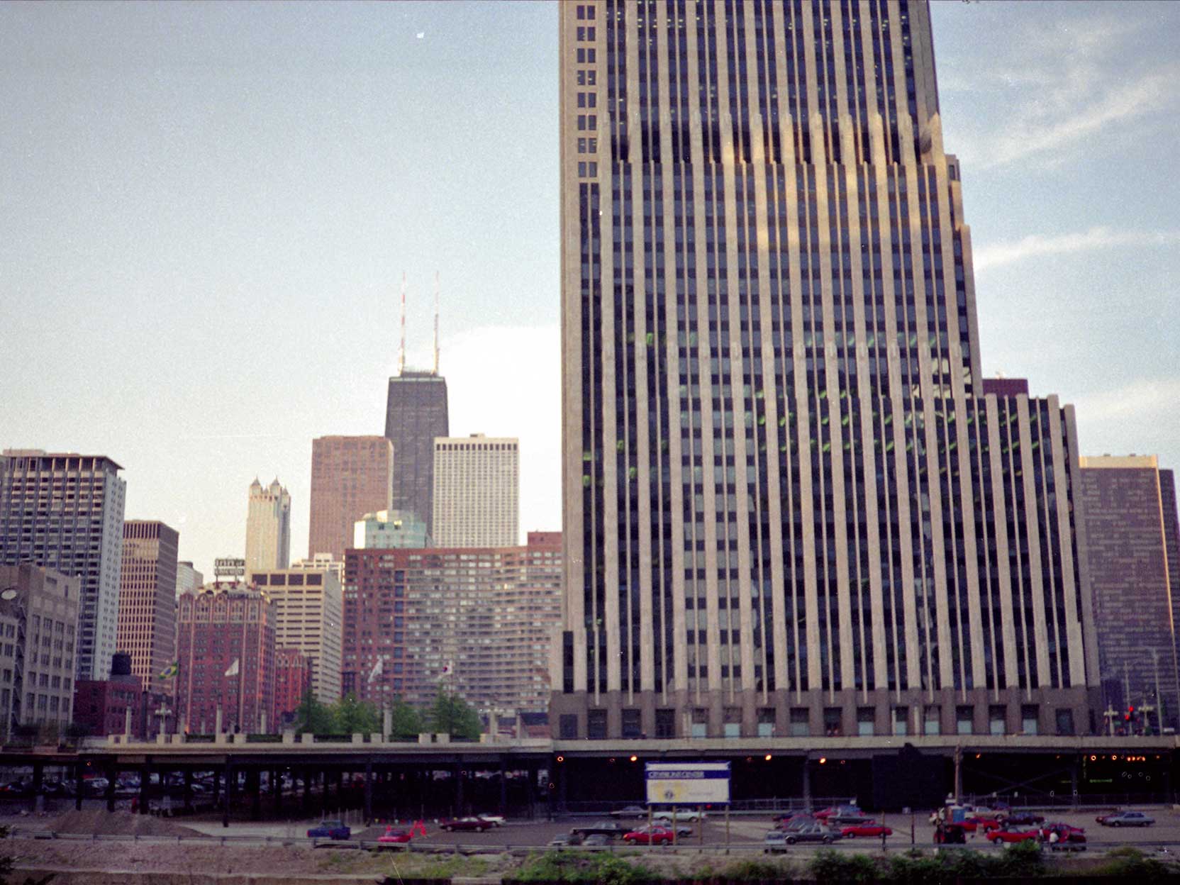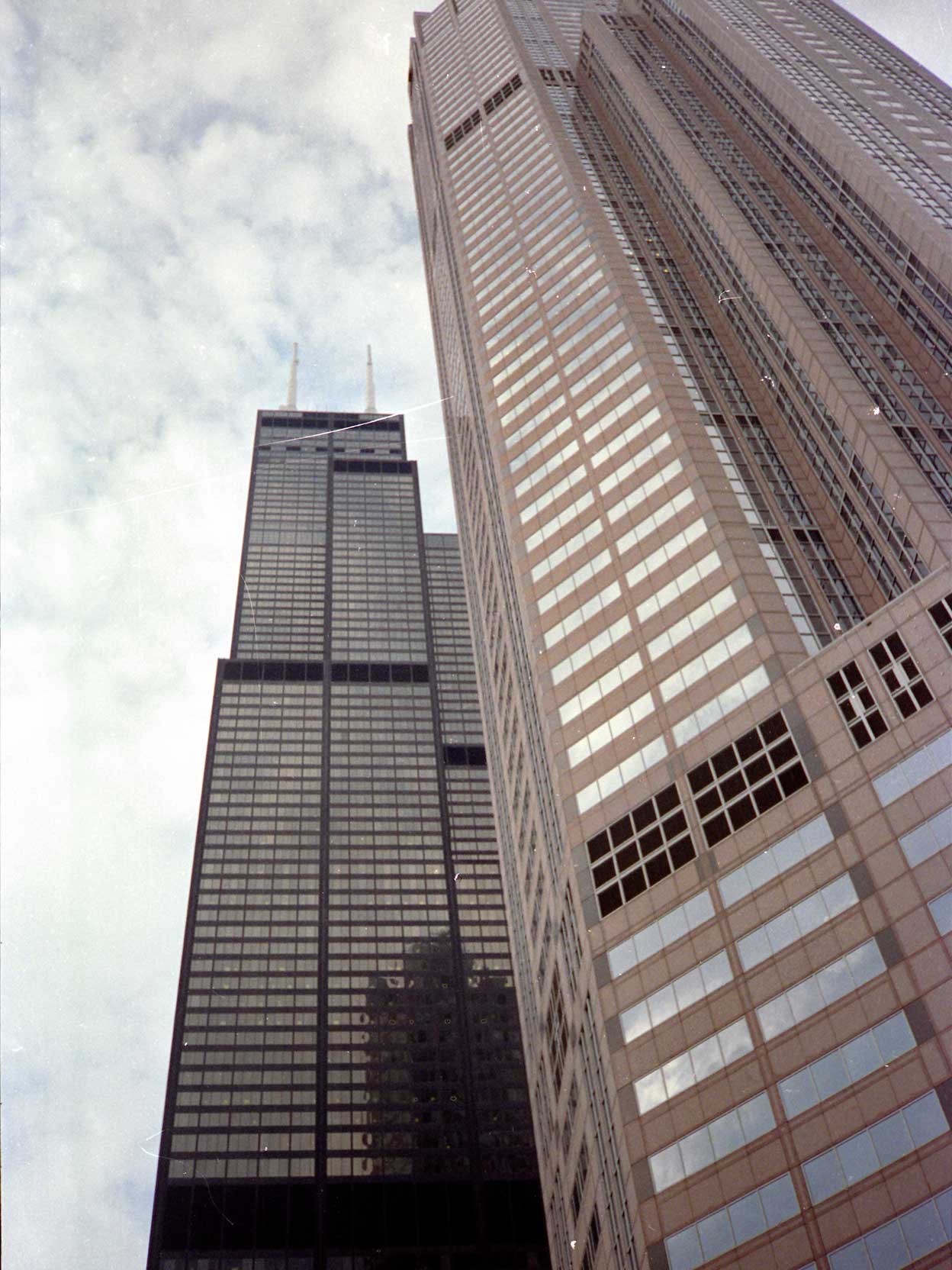 Om een uur of 3 waren we weer op het metrostation en klaar om terug te gaan naar “The Loop”. Daar aangekomen zijn we eerst naar de Buckingham Fountain gelopen, de fontein van “Married With Children”. Toen zijn we naar het Sears building gelopen, het hoogste gebouw ter wereld. We zijn in het gebouw (door Mies v.d. Rohe gebouwd) naar het obsevatory platform gegaan. Schitterend, alleen was het erg druk. Naast het Sears building staat nog een flink hoog gebouw; Als je echter in het Sears building staat is het gebouw ± 75 meter lager; Als je ervoor staat is het bijna net zo hoog. Optisch bedrog dus.