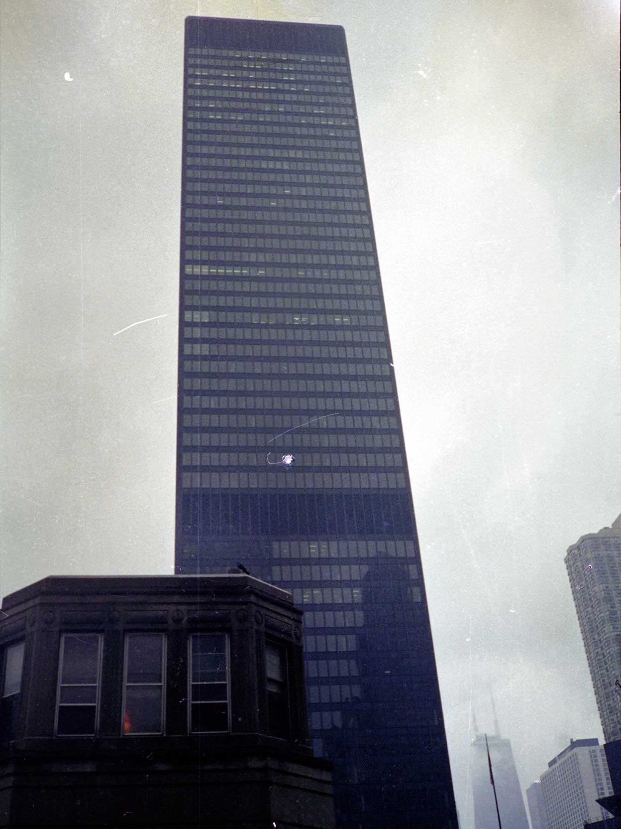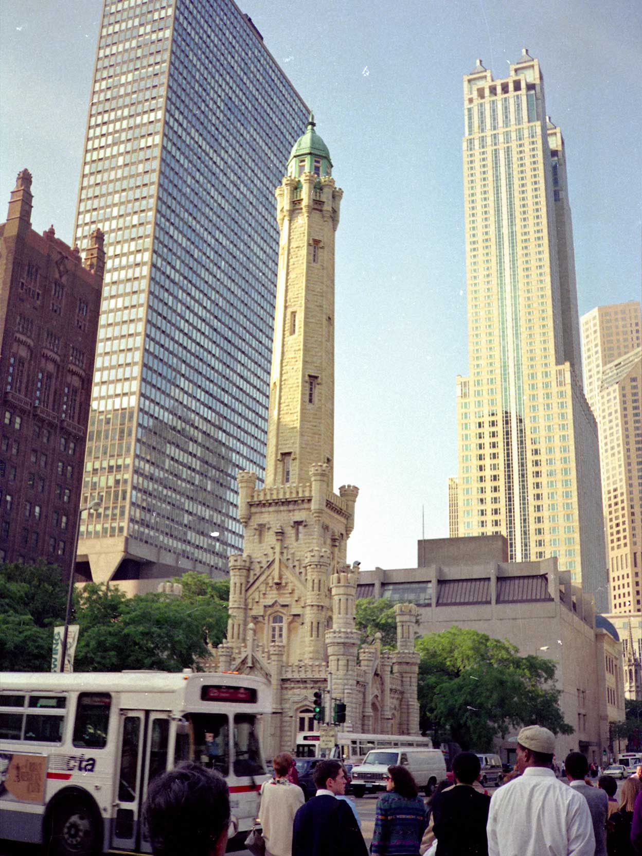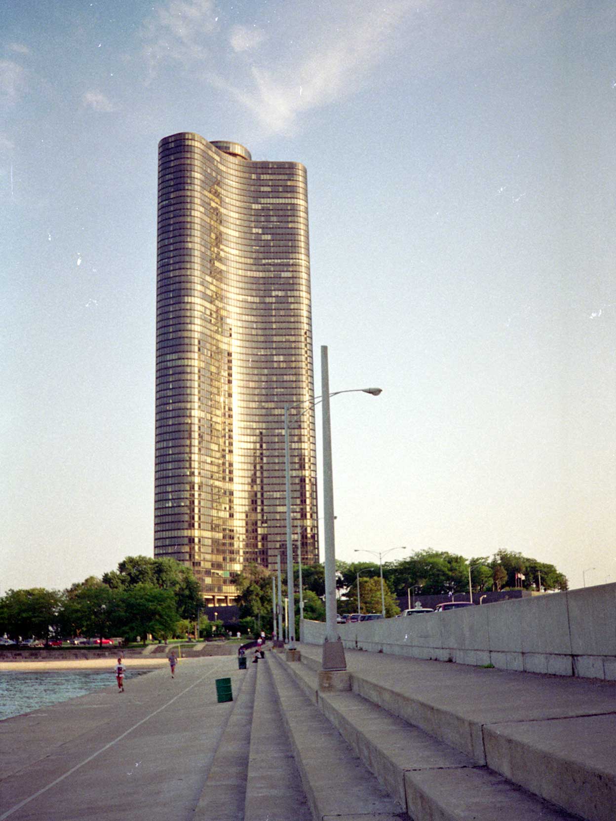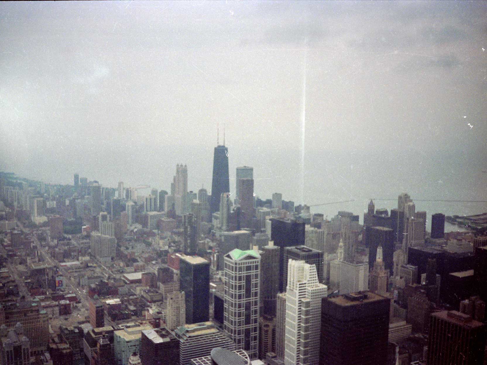 Om een uur of 3 waren we weer op het metrostation en klaar om terug te gaan naar “The Loop”. Daar aangekomen zijn we eerst naar de Buckingham Fountain gelopen, de fontein van “Married With Children”. Toen zijn we naar het Sears building gelopen, het hoogste gebouw ter wereld. We zijn in het gebouw (door Mies v.d. Rohe gebouwd) naar het obsevatory platform gegaan. Schitterend, alleen was het erg druk. Naast het Sears building staat nog een flink hoog gebouw; Als je echter in het Sears building staat is het gebouw ± 75 meter lager; Als je ervoor staat is het bijna net zo hoog. Optisch bedrog dus.