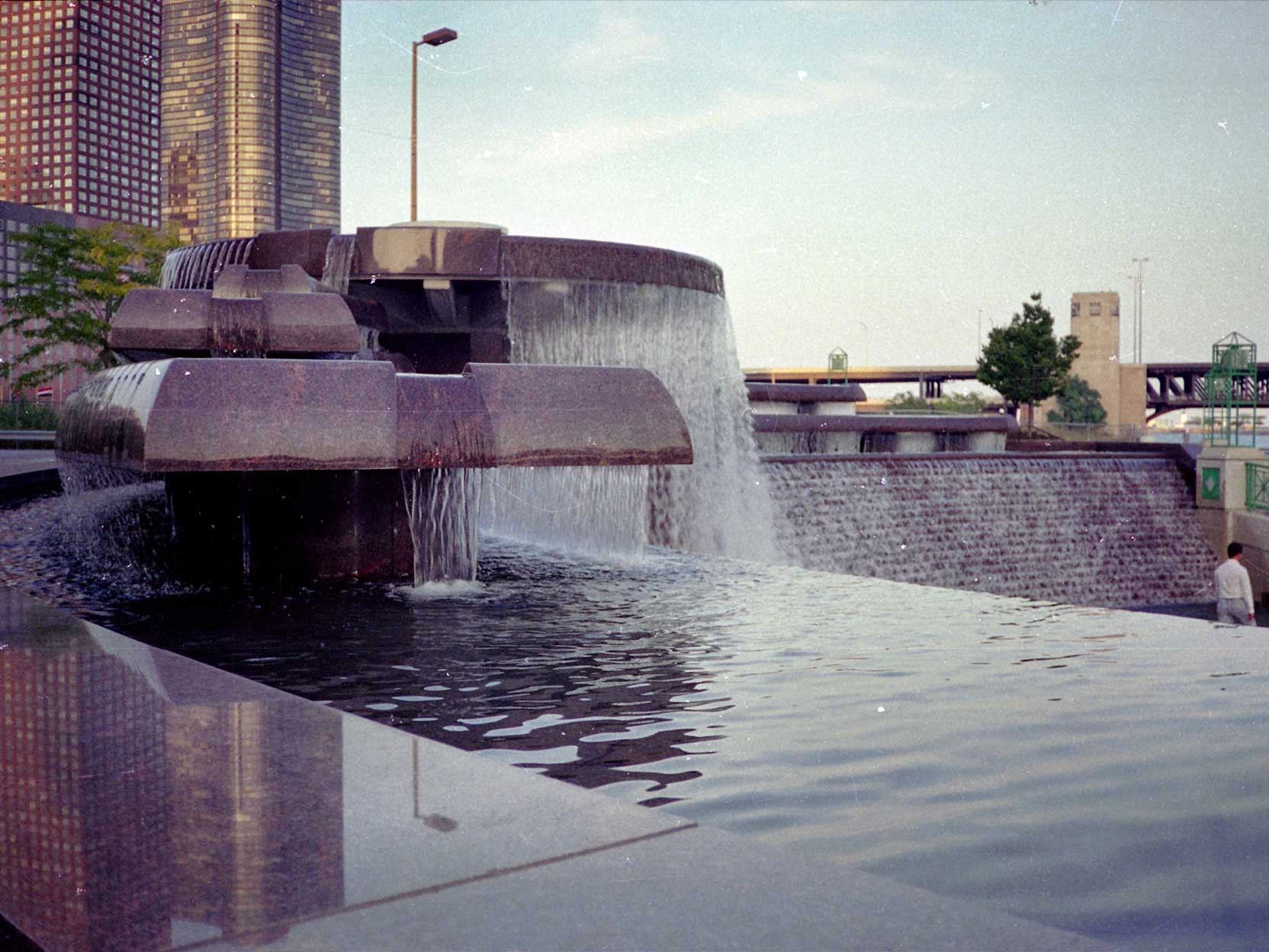 Je mocht er trouwens ook niet zwemmen. Maar het was inderdaad lekker weer. We wilde hiervandaan naar de Centennial Fountain, want we wisten niet welke fontein “de” fontein van Married With Children was. En wij hadden weer eens de kortste weg gekozen. We gingen de brug op en halverwege de brug moesten we naar beneden om de straat in te lopen die de richting van de fontein op te lopen. De weg was dus afgesloten. Konden we weer helemaal teruglopen de brug op. Kortom: via een gigantische omweg kwamen we uiteindelijk bij de fontein. Was wel leuk, maar niet “de” fontein. Edwin stond op een plateau aan de rivier de fontein te filmen en hij was er nog geen minuut af of er kwam een straal water uit, die wel tot de overkant van de rivier spoot. Hij schrok zich te pletter.