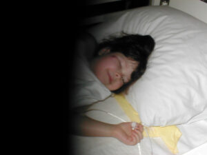 In de linkervoet mislukte het en toen ze bij de rechtervoet gingen pielen (ja want het ging allemaal niet zo soepel) begon Sabine te huilen dat het zo’n pijn deed in haar voet. (??) Acuut werd besloten om dan maar het kapje op te doen. Totaal onvoorbereid want gisteren zou de speltherapeute langskomen om te laten zien wat er zou gaan gebeuren en die is dus helemaal niet geweest. Nu had ik haar zelf al verteld dat ze een infuus in haar voet zou krijgen en dat vond ze geweldig. “dan voel ik het niet” zei ze steeds heel blij. Maar ja nu toch dat kapje. Ze heeft gevochten tegen dat ding, vreselijk om te zien vond ik.
