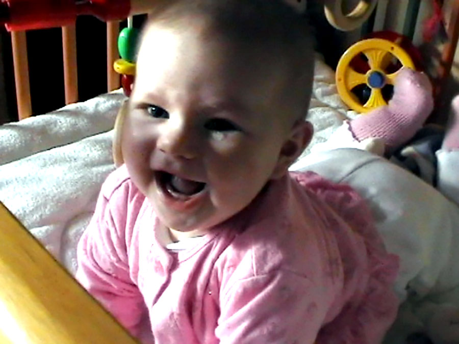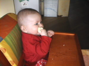 Ja, ja, Laura’s eerste tandje is doorgekomen; een klein scherp puntje rechtsonderin (met 6 maanden 1 week en 3 dagen). Ruim 2 maanden later dan bij haar grote zus. Veel last heeft ze er niet van gehad gelukkig. Ze heeft in elk geval vannacht heel goed geslapen. Hopelijk is dat bij alle “doorbraken” het geval. Eergisteren had ze al haar eerste stukje (wit)brood “gekloven”. Ze zat al dagen het eten bijna bij ons uit de mond te kijken. Ze vindt het heerlijk. Het wordt wel een vies klef korstje maar ze zit er dolgelukkig aan te smikkelen.