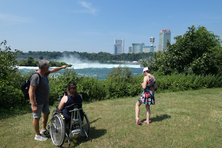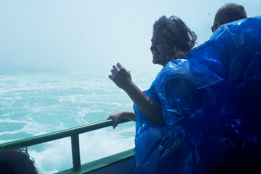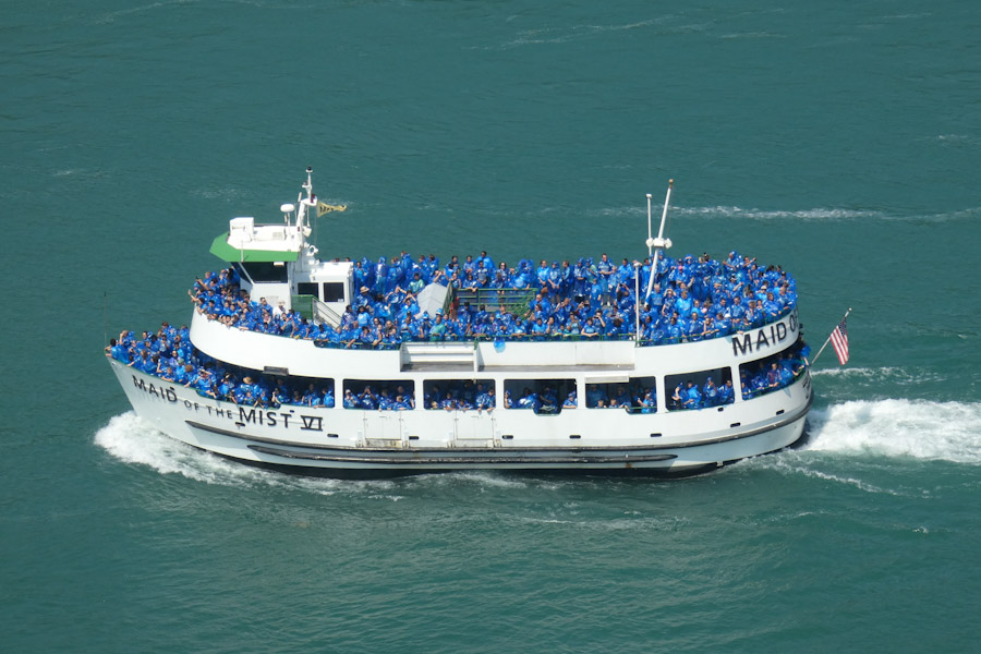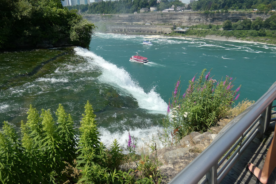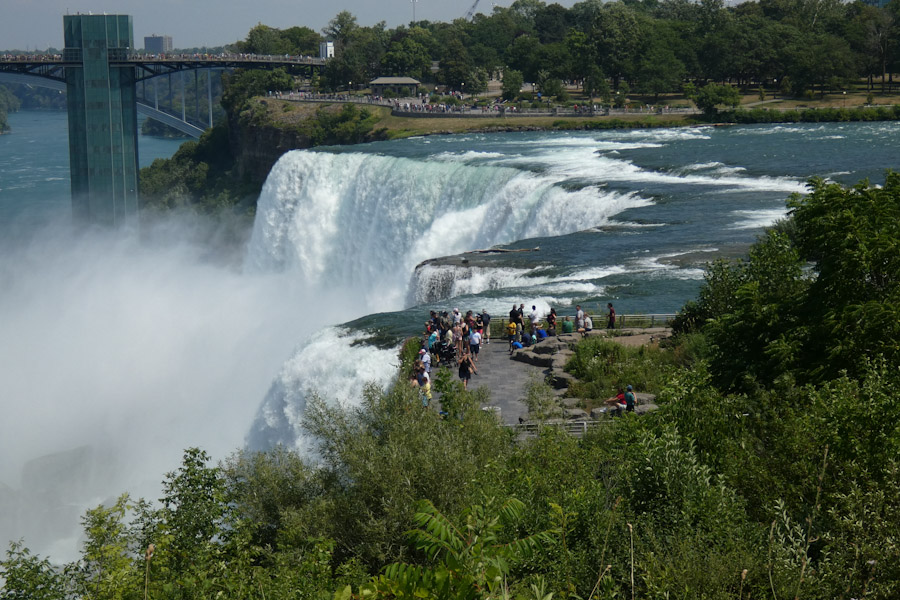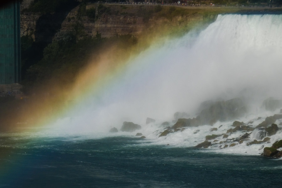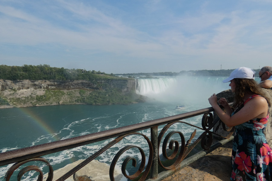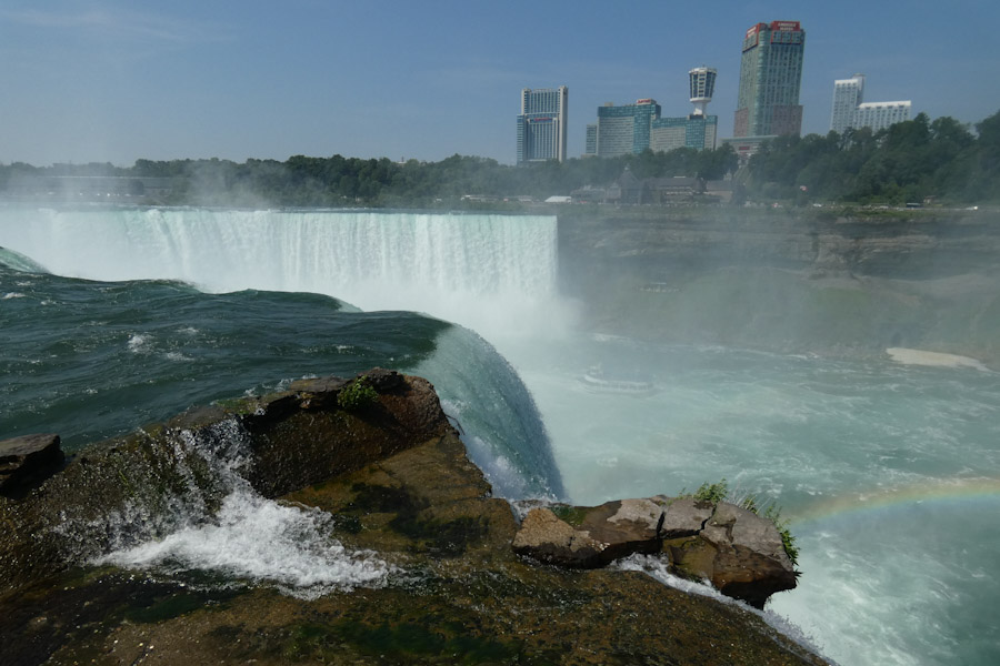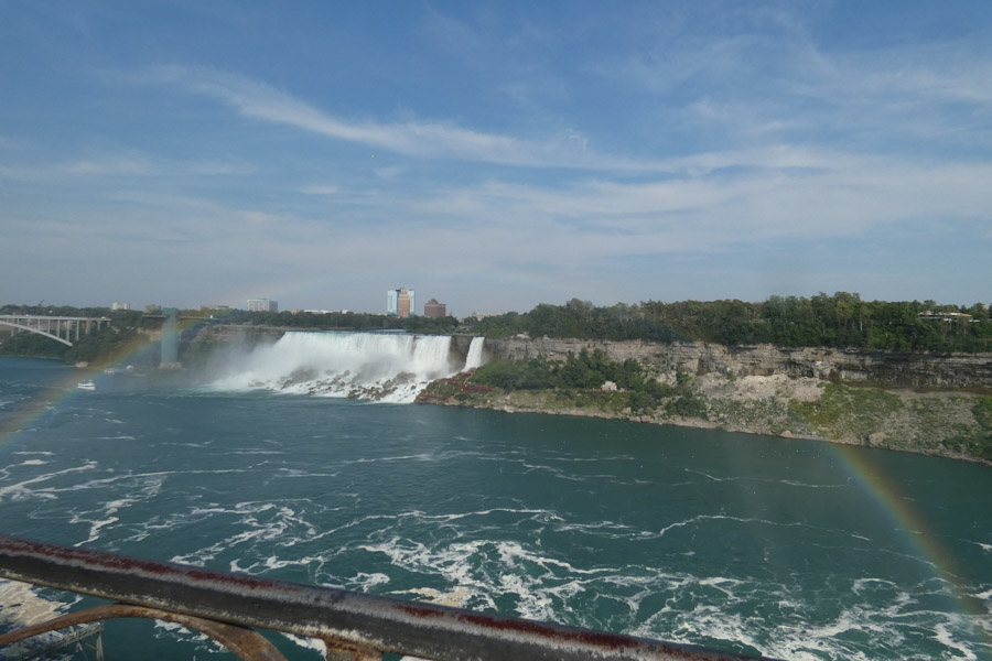 Rond 11 uur liepen we vanuit ons hotel richting Goat Island. Via de Three Sister Islands liepen we naar het punt waar je naast de Horseshoe Falls staat en ze naar beneden ziet vallen. Daarna liepen we verder naar Luna Island. Daar stond je tussen de Bridal Veil en de Amerikaanse Falls in. Prachtig, wat een watergeweld. Na nog een stukje lopen kwamen we bij de Observation Tower, waar ook de opstapplaats was voor de Maid Of The Mist. 27 jaar geleden weigeren wij mee te doen met zulke ‘domme’ toeristische attracties, maar het was toch wel erg leuk nu, we werden echt zeik- en zeiknat en vaarden ook echt in de Horsehoefalls .